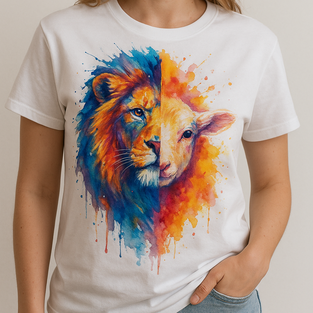 Inspirada na simbologia cristã do Leão de Judá e do Cordeiro de Deus, essa peça traz uma arte exclusiva em estilo aquarela, com cores vibrantes e traços expressivos que traduzem fé, coragem e leveza.